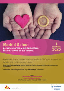 Madrid Salud: Personas sordas y sus cuidadores, la salud sexual en tus manos. GRATUITO FECHA: 1 diciembre. A las 10:00 h. LUGAR: Florestan Aguilar, nº 11 bajo local. 28028. Madrid ¡Únete al Taller para Mujeres ... y más