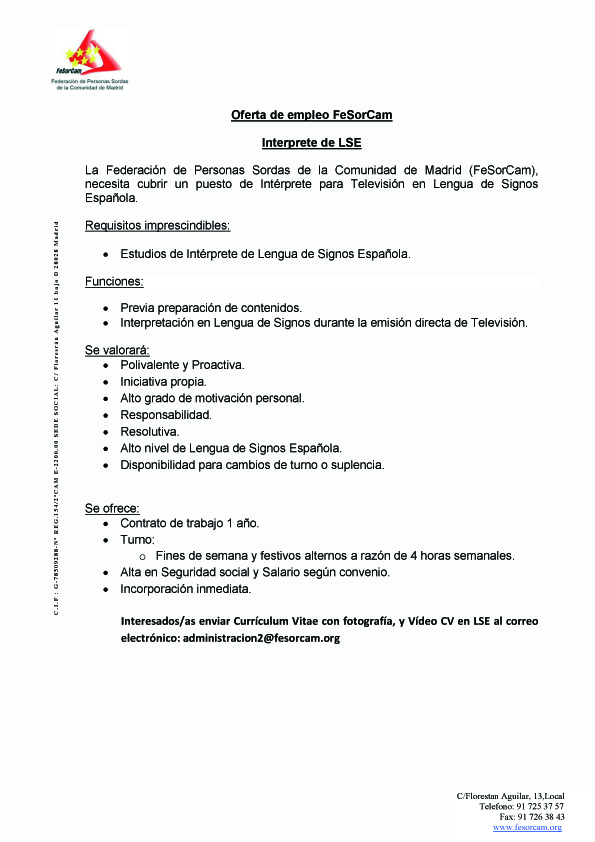 URGENTE OFERTA DE EMPLEO FeSorCam Interprete de LSE