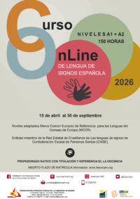 Cursos Online de Lengua de Signos Española Niveles A1+A2 / 15 de abril al 30 de septiembre de 2026 Galería Cursos Online de Lengua de Signos Española Niveles A1+A2 / 15 de abril al 30 de septiembre de 2026 Cursos Online de Lengua de Signos Española Niveles A1+A2 / 15 de abril al 30 de septiembre de 2026Cursos de Comunicación de LSE | 4 marzo, 2026webmaster2026-03-04T12:50:01+01:0004 marzo 2026|