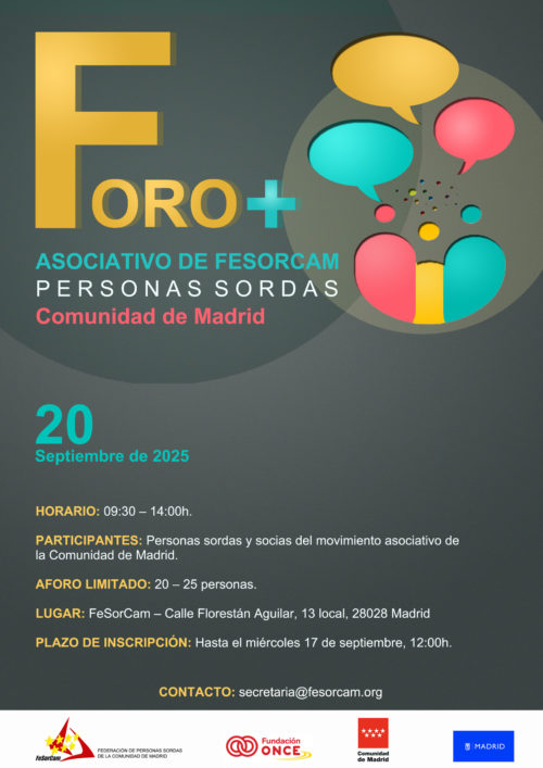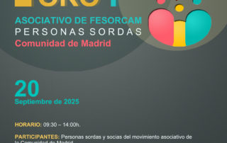 FORO ASOCIATIVO DE FeSorCam • Fecha: Sábado, 20 de septiembre de 2025 • Horario: 09:30 – 14:00 • Participantes: Personas sordas y socias del movimiento asociativo de la Comunidad de Madrid • Aforo limitado: 20 ... y más