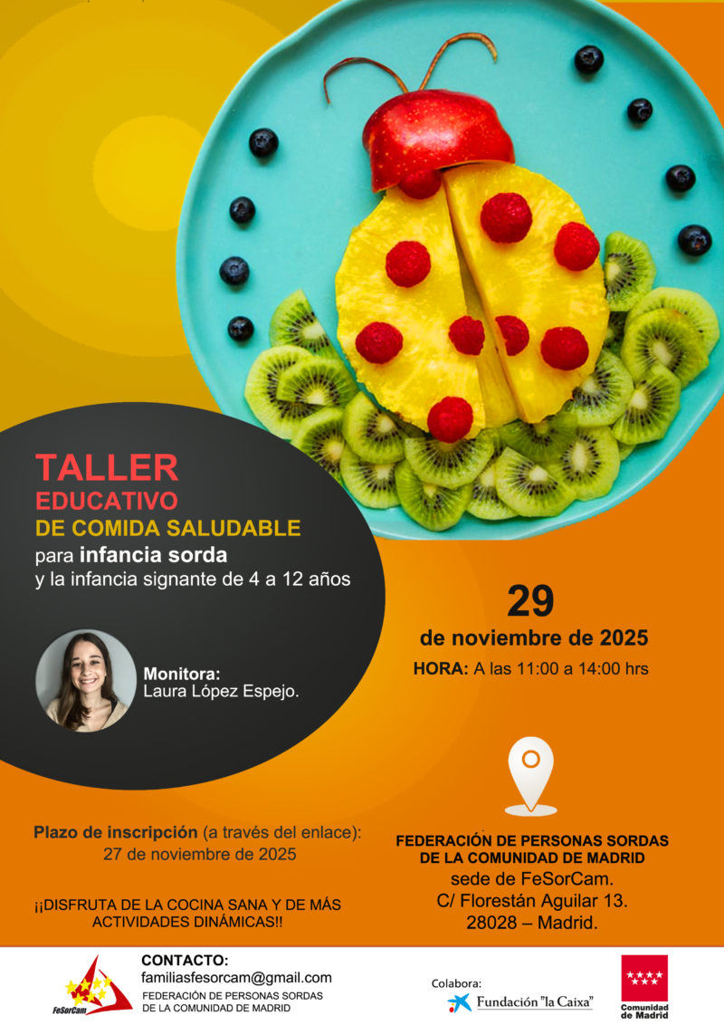 TALLER EDUCATIVO DE COMIDA SALUDABLE PARA INFANCIA SORDA E INFANCIA SIGNANTE DE 4 A 12 AÑOS webmaster2025-11-18T13:41:14+01:0018 noviembre 2025| Ver imagen más grande Más ImpresiónEmpieza en 10 Días, 13 Horas29 noviembre, 2025 11:00 ¡Comparte esta historia, elige tu plataforma! FacebookTwitterLinkedInWhatsappEmail